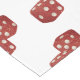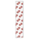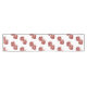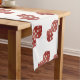 This table runner features a sophisticated and glamourous game night or casino theme. An image of red glitter dice is tiled across a white background.