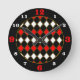 Red diamonds outlined in gold highlight this bold black & white harlequin design. Numbers on a black background make it easy to tell the time. Larger red numbers mark each quarter hour.