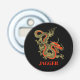 A fierce black Chinese dragon outlined in gold decorates this button bottle opener. Red accents highlight the dragon's jaw, head and spine. Your name is written in bold gold below.