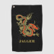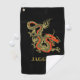 A fierce black Chinese dragon outlined in gold decorates this golf towel. Red accents highlight the dragon's jaw, head and spine. Your name is written in bold gold below.