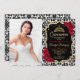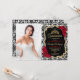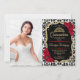 Quinceanera party invitation with your photo. Features black white damask, script font, red roses, tiara and confetti. Classy black white red design with faux glitter gold. Perfect for an elegant celebration.