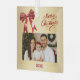 A faux gold looking background, red text and a red bow. Text and photo. Merry Christmas is written with a elegant hand-lettered style font.