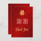 This Chinese wedding thank you card in traditional colours features an artistic gold double happiness symbol on a ruby red background, traditional Chinese thank you words and English thank you words in an elegant modern handwritten script. Matching wedding stationery and other products available.