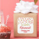 Happy retirement favour tag sticker with red and gold confetti pattern.