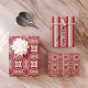 This fun wrapping paper set features three different farmhouse chic patterns of red, gold, and cream. One looks a bit like a quilt pattern with four-pointed star-like shapes, a pattern with repeated floral mandalas, and then a third pattrn of mixed stripes. The stripes are regular printing on paper but they almost seem like fabric, with a mix of gingham, dotted Swiss, gold chains, and florals. This set coordinate with other country farmhouse red, tan, and cream patterns, cards, and tags, and looks great with a variety of accents, such as bows, ribbons, natural elements like pinecones or leaves, and string. #farmhouse #stripes #striped #country #red #cream