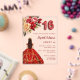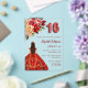 A modern, stylish and glamourous invitation for a Sweet 16, 16th birthday party. A clear, transparent background, a girl wearing a red and gold dress and red, pink and golden roses, florals. The name is written with a modern hand lettered style script. Personalise and add your party details.