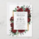 Design features watercolor peony and rose floral elements in shades of red and burgundy over eucalyptus botanical greenery. Template also features a printed gold coloured box for added elegant layout. The typography displays a modern layout with black text. View the collection link on this page to find matching products within the wedding set.