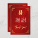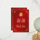 This Chinese wedding thank you card in traditional colours features a Chinese frame, an artistic gold double happiness symbol on a ruby red background, traditional Chinese thank you words and English thank you words in an elegant modern handwritten script. Matching wedding stationery and other products available.