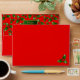 Elegant and traditional. A classic red & green holly berry pattern on a striking bright red background with a green gradient text box containing elegant gold text and gold borders.
