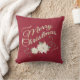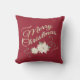 This pillow features a vintage inspired digital graphic of white poinsettias on a dark red background. The script text, in a gold gradient colour, reads: Merry Christmas.