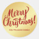 Merry Christmas is written in a bold and festive script across a smooth gold background. Your name is written below in simple block letters. In additional to sealing envelopes with them, you can add them to gift packaging.