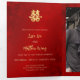 This elegant bilingual Chinese wedding invitation features an artistic gold double happiness symbol on a floral ruby red shimmering background. Bride and groom names in an elegant handwritten script. Chinese wedding invitation or tea ceremony invitation. With your photo in the centre of the tri-fold wedding invitation and a traditional Chinese text at the right inner side. At the backside are the details and a scannable qr code for your wedding website.