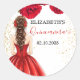 Add a touch of royal elegance to your celebration with these custom Quinceañera round stickers. Featuring a stunning girl in a vibrant red gown, surrounded by red roses and a sprinkle of gold glitter confetti, these stickers are the perfect finishing touch for your sweet 15 stationery.