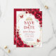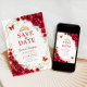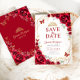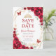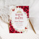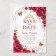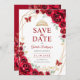 Red, gold and white Quinceanera celebration save the date card. Features, script font, gold butterflies, watercolor roses and tiara. Perfect for an elegant princess style glam celebration. Personalize with your own details. Printed Zazzle cards or instant download digital printable template.