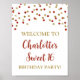 Custom text sweet 16 birthday party poster with red and gold confetti.
