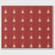 A red coloured background. Decorated with a snow covered tree. Merry Christmas is written with an elegant hand-lettered style script. Personalise and add your family name. Golden text.