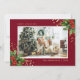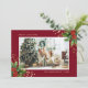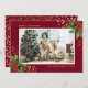Elegant red watercolor photo Christmas cards featuring a dark red photo frame decorated with watercolor illustrations of holly with berries and faux gold foil confetti. Easily personalise these red watercolor Christmas photo cards with your image and text.