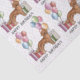 Destei's original cartoon illustration of a cute mahogany red or reddish brown coat colour Golden Retriever breed dog. The dog is placed in a colourful birthday setting with pastel colour birthday balloons and gifts. The pastel colours include pink, green, blue, red, orange and purple. The background has a playful pastel colour polka dot pattern. There is also a personalizable text area that now reads: "Happy Birthday!". The design is placed six times creating a small pattern.