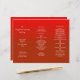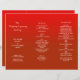 Tri-fold red wedding program to fold after purchase. White text is uppercase printing with script for the title. Red colour on both sides of the paper is a light to dark red gradient. Use all capital letters to recreate this look. Customise three sections which will create an accordion style ceremony program. Lines on the back are provided to help fold evenly.
