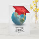 red graduation cap on globe card