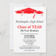 This vertical format minimalist class reunion invitation design features black and red text on an all white background with three red graduation caps as the top border. Personalise your information, remove information or edit using the design tool to select a font colour, size, and style your prefer.