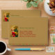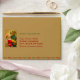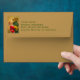 This delightful vintage-style Christmas envelope features Santa Claus climbing a festive tree decorated with golden bells and topped with a golden bow. The envelope template includes customisable fields for the postman, recipient, sender, and a banner along the bottom front that currently says "Ho! Ho! Ho!" in red and green fonts. Designed in classic Christmas colours of red, green, and gold, this beautifully crafted envelope pairs perfectly with Christmas cards, postcards, or any of our matching home decor and ornament options.