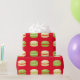 This stylish holiday design features French macaron cookies in festive colours of green and white, with red frosting. The background is a deep Christmas red. A very chic and Parisian way to celebrate Christmas!