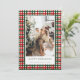 Wish friends family Happy Holidays with a personalised red & green plaid Christmas DIY photo Christmas card showcasing your family on the front over a watercolor red and green Christmas plaid pattern, and a back side with 3 family pictures and an editable note and a cute little Christmas teddy bear.