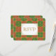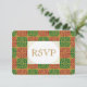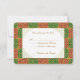 A custom holiday RSVP card template with script letters in a golden frame on an elegant pattern of fleur de lis in green, red and golds. Click Customise It to change fonts or colours, sizes, even save your design for later.