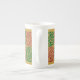 An elegant bone china mug with red and green Christmas art with a vintage fleur de lis pattern restored from antique tiles.