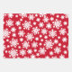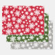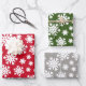 Three coordinating Christmas/Holiday wrapping paper sheets. Red, Green and Silver Grey with white snowflakes.