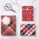 Bold, modern, and festive three-sheet Christmas wrapping paper set. Design features three complementing pattern designs With two different plaid patterns and one sheet designed with Christmas typography with different festive words for the holidays arranged together to create a fun Christmas typographic pattern design. Original designs and pattern artwork by Moodthology Papery.