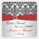 "Love is Sweet! Please take a treat!" is the text on this affordable 1.5" square shaped black and silver grey damask wedding favour or candy buffet sticker which has a PRINTED red ribbon and a PRINTED diamond jewels buckle on it that matches the wedding invitations shown below. ****PLEASE make sure to not have your text right up to the edge, as it will get cut off during printing. The bottom of the date text lies just inside the edge of the safe zone, so don't go beyond that with any of your text. ALSO, use caution if you change to one of the other shapes, as some of the design and/or text may get cut off. This was set up on the square sticker, so any others are not advised. If you need assistance with this, or If there are any other matching items you require, please email your request to niteowlstudio@gmail.com.