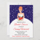 This festive and fun bridal shower invitation features a beautiful red hair bride in a white wedding dress with a poinsettia flower bouquet. In the background are snowflakes on a navy blue background. The text combines script and sans serif fonts for a stylish and modern look. This is perfect for a Christmas or winter themed Bridal Shower.