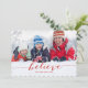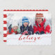 Send out your Christmas greetings to your friends and family using this beautifully, simple holiday photo card with the word "Believe" written in a red script font overlay. Design by ELKE CLARKE© FOR MONOGRAM GALLERY. Replace sample photo with your own. Red and white striped background on back of card. Other colours available in store. Contact designer.