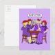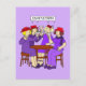 A group of ladies wearing red hats and purple outfits sit around a table drinking cocktails. The ladies are saying 'Invitation'.