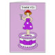 A simple illustration of a lady standing on a giant cake. The lady is wearing a red hat and a mauve dress, and holding a cocktail in one hand, while saying 'Thank you'. The image is set against a mauve coloured background.