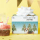 Destei's original cartoon illustration of a red headed tricolor coat colour Pembroke Welsh Corgi breed dog. The dog is placed in a winter scene with three green fir trees. The background is a blue to white gradient giving the design that cold winter day look. There is a personalizable text area that now reads: "Merry Christmas!" together with a custom name.