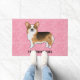 Destei's original cartoon illustration of a red headed tricolor coat colour Pembroke Welsh Corgi breed dog on a pink background colour with a pattern of hearts in different sizes. Under the dog image there is a personalizable text are for a family name or other custom text such as "welcome", for example.