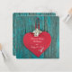 Red wooden heart on turquoise painted barn wood for vow renewal invite.
