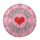 Red Heart, White with Black Outline Text on Pink Coloured Dart Board - Personalise top and bottom text to your liking!