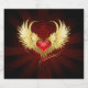 Bright red heart of an angel with golden wings shining in the dark radiant red background decorated with a pattern.