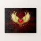 Bright red heart of an angel with golden wings shining in the dark radiant red background decorated with a pattern.
