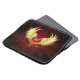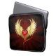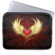 Bright red heart of an angel with golden wings shining in the dark radiant red background decorated with a pattern.