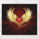 Bright red heart of an angel with golden wings shining in the dark radiant red background decorated with a pattern.
