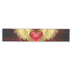 Bright red heart of an angel with golden wings shining in the dark radiant red background decorated with a pattern.
