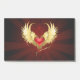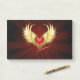 Bright red heart of an angel with golden wings shining in the dark radiant red background decorated with a pattern.