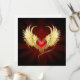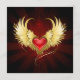 Bright red heart of an angel with golden wings shining in the dark radiant red background decorated with a pattern.