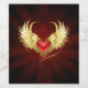 Bright red heart of an angel with golden wings shining in the dark radiant red background decorated with a pattern.