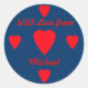 One big red heart in the middle, and four smaller ones on the left and right side and on top and bottom of the sticker, with the words "With Love from Michael" written between them. You can easily insert your words and the name of your choice, and you can easily change the colour of the background. This is the perfect gift sticker for your Valentine's Day gifts!